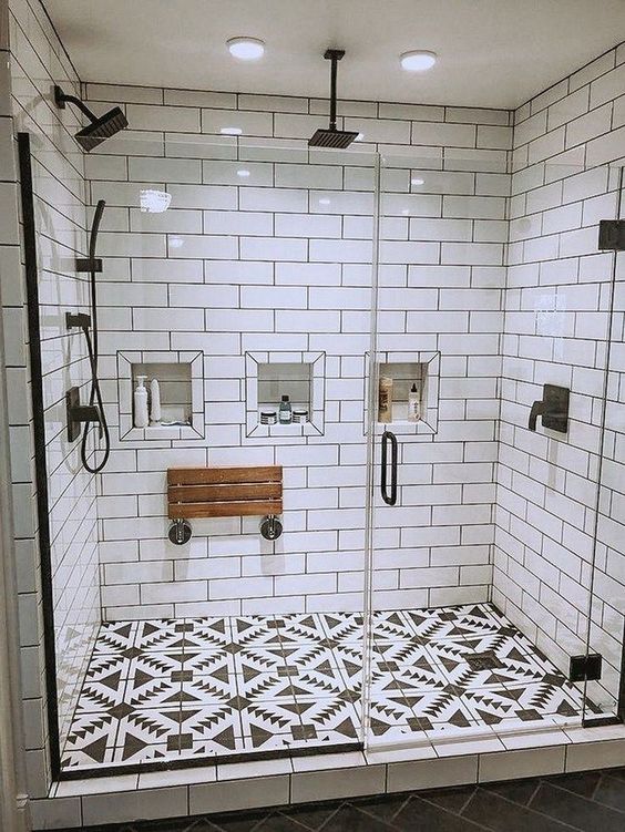 On the kiddie pool side wall is the water feature where water trickles down this bumpy surface and into the kiddie pool. The texture adds depth to the walls and matches the white glossy subway tiles in the bathroom.