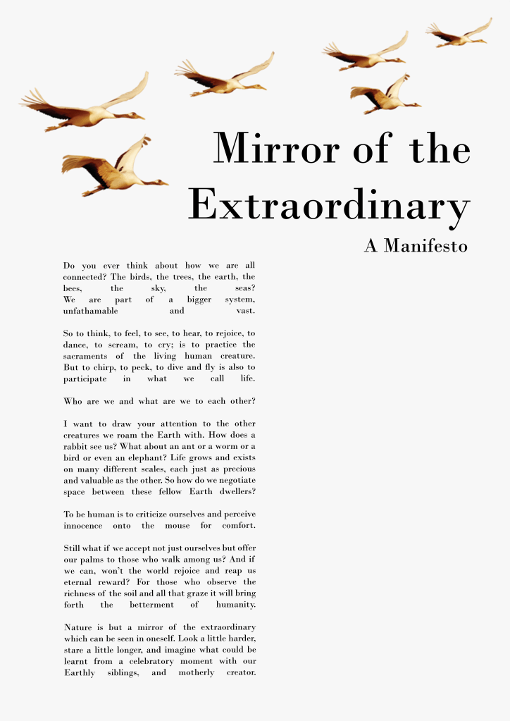 My final manifesto takes on an extrospective tone, challenging how we as a society view ourselves and others, how we share and compromise space, and consider how we are all connected with the earth. I examine the relationship between the internal world of the self and the external world of nature (symbiotic relationships).