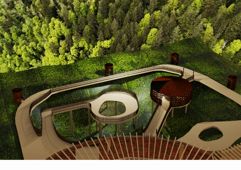 With considering the feedback from my last class and design proposal- I had made further changes to my design. Rather than having a tea counter at the entrance of the fernery, seating in the hut, and rockery beds with tea signs and plants as the tea ‘zones’, Comments from my peers included that the walk felt disconnected and disjointed to the hut and the bar. Another comment included that there was lots of potential to turn the areas of information on Maori tea history into more impactful designs. I then was inspired by the Rotorua Redwoods public toilets to create atmospheric spatial experiences for my teas. I found potential in the hut where people can sit around and drink tea to turn into the source of where to get their tea beverages from. this would draw a stronger connection to the people and environment. It turns the walk into a destination place for all to come together, learn, heal and share in this amazing history of Maori medicine.