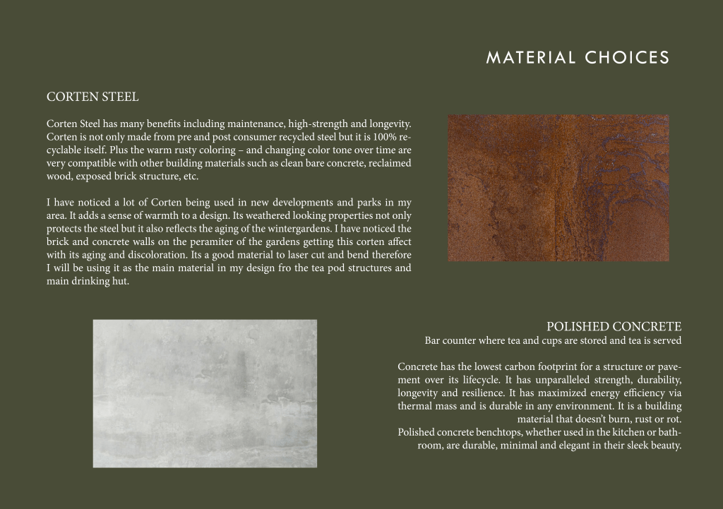 The Host – My design proposal requires a host/waiter who operates the tea counter to serve people tea. This position is vital in my design as they will be delivering the service of the tea experience directly to visitors/public. They need to be well informed about native New Zealand plants, specifically the five tea plants entangled in this tea walk atmospheric experience. They will be warm, welcoming, friendly and helpful in assigning people with one of the five teas which would be most beneficial to them, if they have issues with choosing. People can of course choose to try all five teas as they wish. The role of the host is to inform and make all feel welcome. They will go in to detail of the history of Maori medicine if people wish to learn more. They will be the essence of the experience and they will physically provide visitors with the sacred, tactile tea drinking ceremony and experience.
